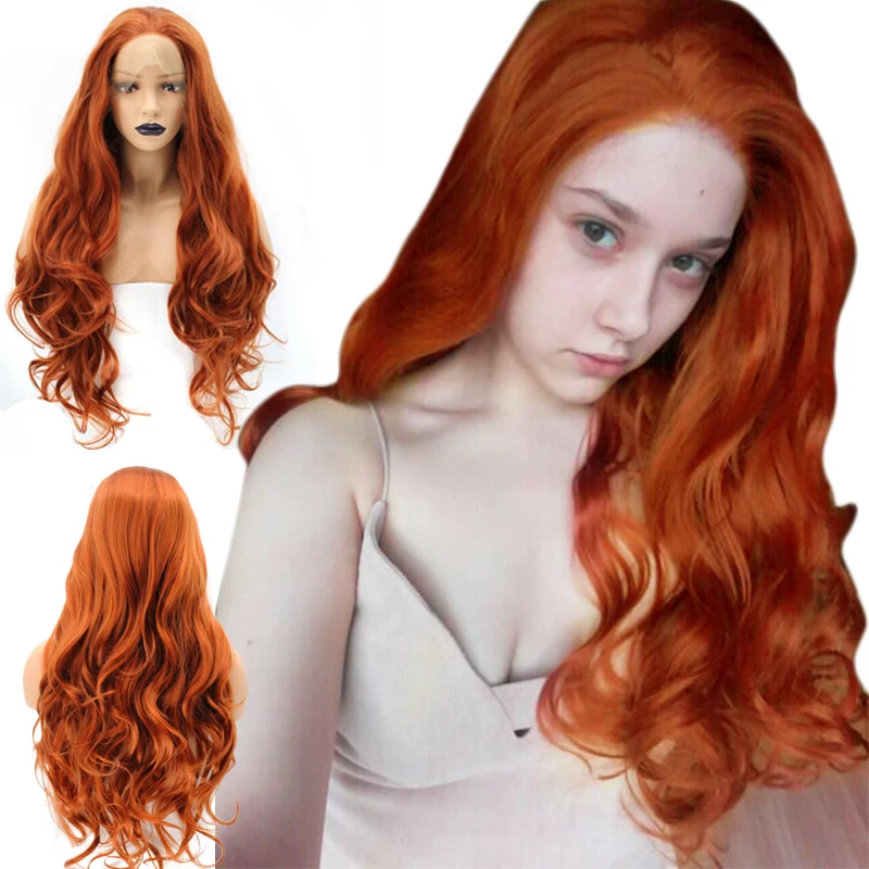 Anogol High Temperature Fiber Free Part Orange Natural Long Body Wave Copper Red Synthetic Lace Fro