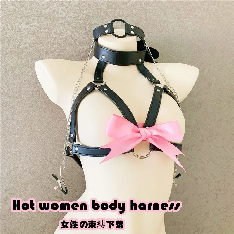 Sexy Bra Pink Ribbon Gag Sm Binding Adjustable Tourniquet Body Suit Pu Leather Nipple Clamps Sex To